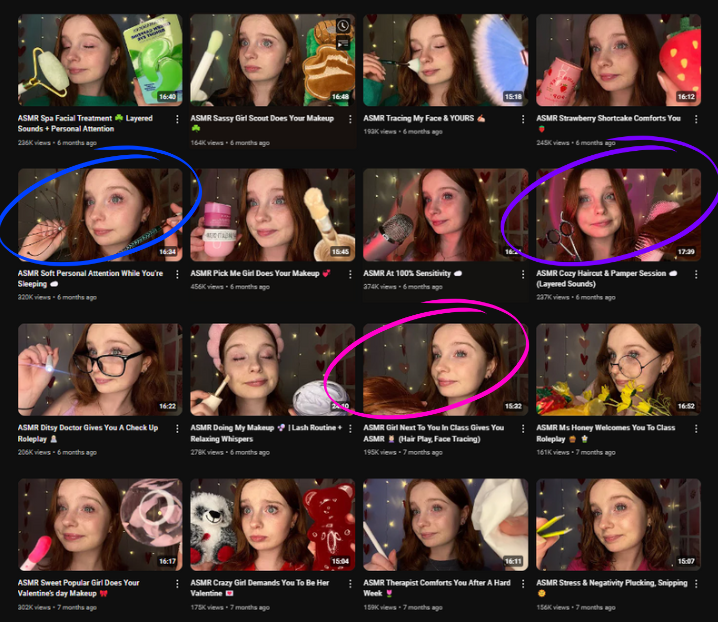 Many of these are role-play videos, which often explicitly reference childhood ‘nostalgic’ experiences: “girl sitting behind you in class braids your hair” or “school lice check: detailed scalp exam”.