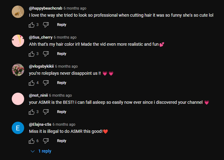The popularity of hair play and grooming ASMR videos seems to relate to the deep-seated appeal of having someone touch and groom your hair. The comments beneath these videos describing them as tranquil, calming, relaxing and sleep inducing.